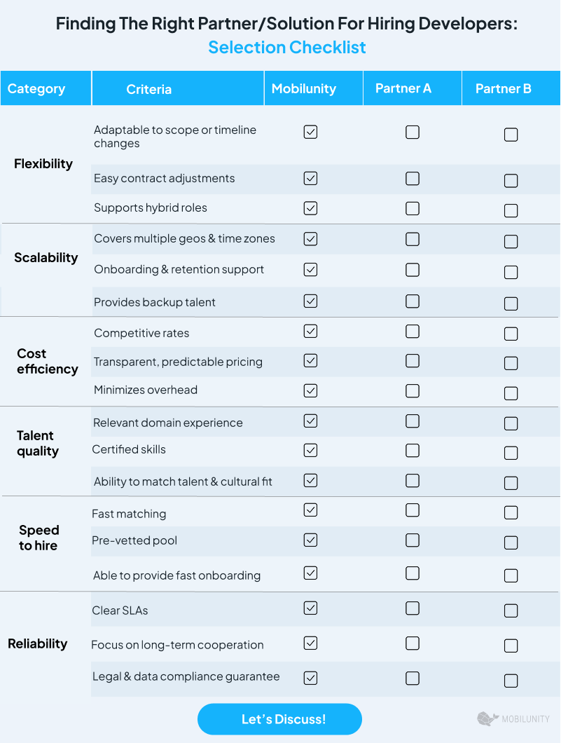 Create a checklist to compare partners based on factors like pricing transparency, time-to-hire, communication, tech stack, support, etc. This way, you’ll ensure your decision is well-grounded.