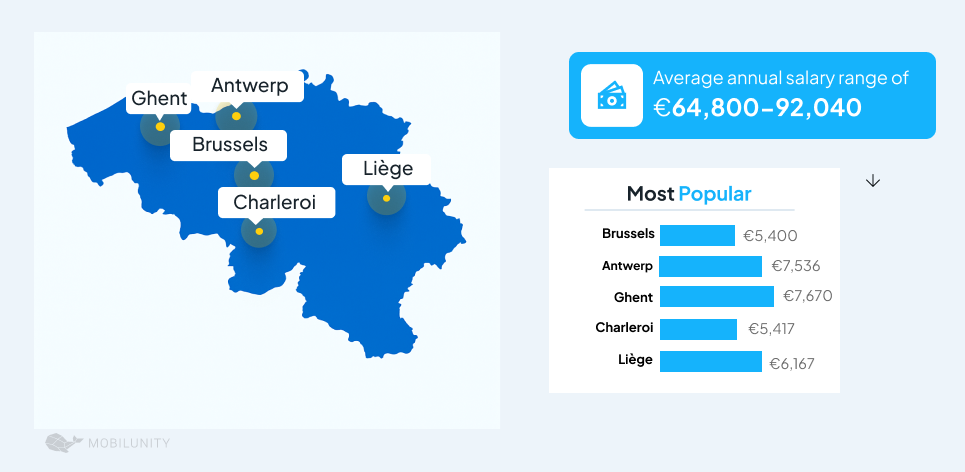 The most popular technologies are PHP, .Net, Java, Angular, Laravel, Magento, and many others. Brussels and Antwerp can be considered as two top IT cities where you can hire developers in Belgium. Analyzing how much does it cost to hire developers in Brussels, it should be noted that a JavaScript developer and a .Net developer earn approximately $9,540 and $5,430 accordingly. An average monthly salary of a Brussels developer with PHP skills is $5,230.