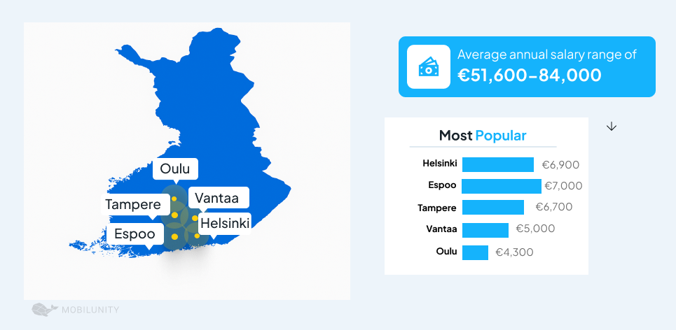 Vantaa, to the northeast of Helsinki, is home to many transportation and storage facilities. According to data compiled by Glassdoor, a software engineer in Vantaa can expect to earn an average monthly salary of €5,000. The city and its suburbs are home to an estimated 4,000 software engineers.