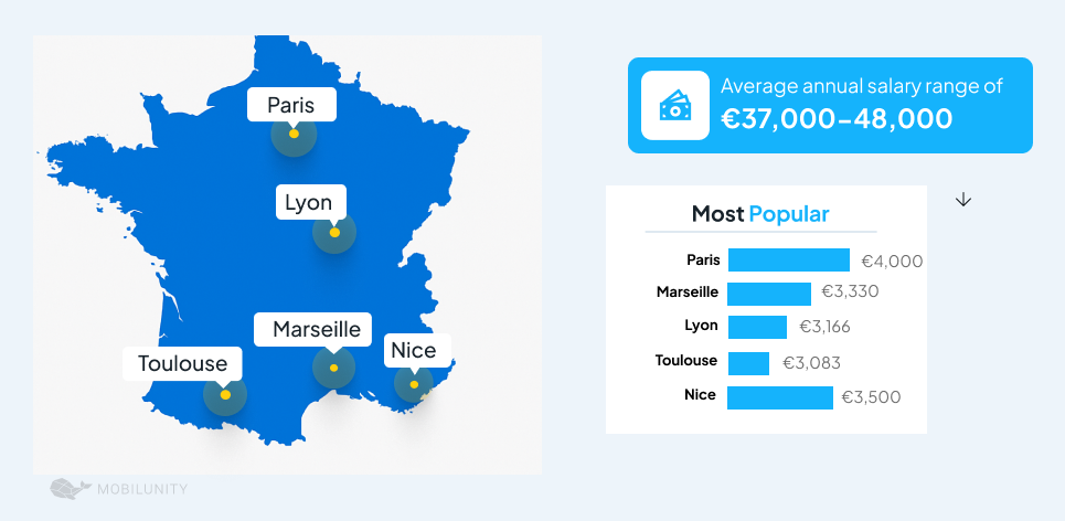Paris, located in the center of France, serves as a model of creativity and progress. This city has established itself as a technological center thanks to its large population of developers (about 128,000). In Paris, programmer salary in France can vary from €48,000 to €80,000 per year. Software engineers in this city, with all its historic allure, find themselves at the crossroads of history and the future.