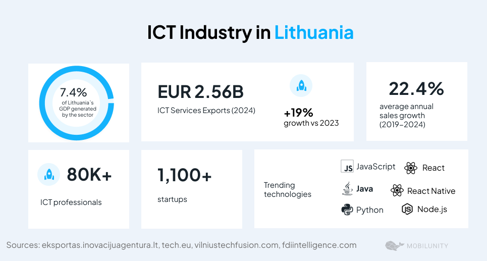 Lithuania’s ICT industry is a major pillar of the economy, accounting for 7.4% of national GDP and exporting services worth EUR 2.56B in 2024, a 19% increase from the previous year. With around 80,000 ICT professionals, 4,000 IT companies, and more than 1,100 startups, the sector continues to expand rapidly. Technologies like Python, JavaScript, Java, React, React Native, and Node.js dominate the market, showcasing a developing, innovation-driven tech landscape.