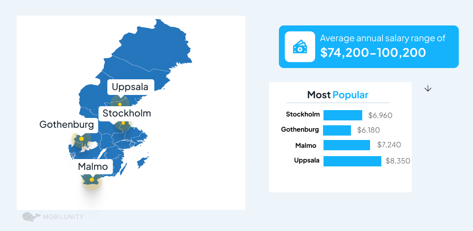 Nearly 190,000 people live in the fourth-largest Swedish city, while LinkedIn shows 207 IT companies registered in Uppsala. Here, you’ll find offices of Microsoft, Coupa Software, Consid, and other ICT companies. An Uppsala-based software engineer Sweden gets approximately $100,200 a year.
