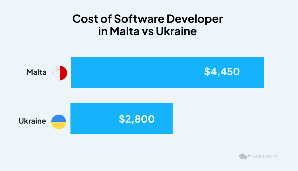 In comparison with the payment rates in Malta, Ukrainian wages of the highly qualified experts are much more comfortable. An average annual payment of a developer in Ukraine is $30,000/year, according to Mobilunity’s Recruitment Team research on the local Job markets. If you are interested in how to find a tech cofounder, we have a suggestion for you. Eastern Europe, particularly Ukraine, is a good place to find startup partners.