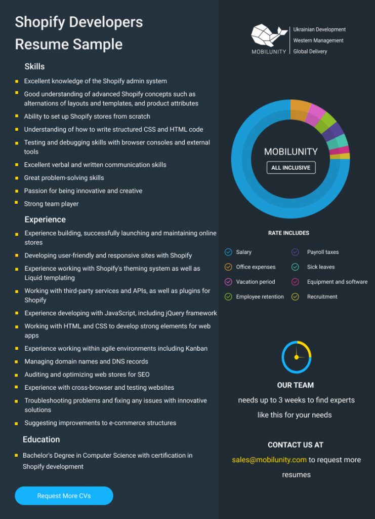 Due to thorough research, Mobilunity contracts seasoned Shopify developers who fit your project requirements. They use advanced approaches to deliver practical solutions that help your revenues grow.