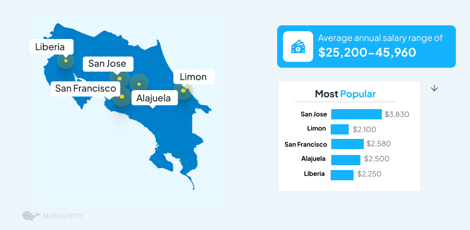 San Francisco in Costa Rica, not to be confused with its namesake in California, is a lesser-known hub for tech enthusiasts. Developers here earn an average of $2,580 and the city boasts of an estimated 330 software developers. Its quiet charm combined with tech growth makes it an interesting spot for IT professionals and outsourcing companies Costa Rica.