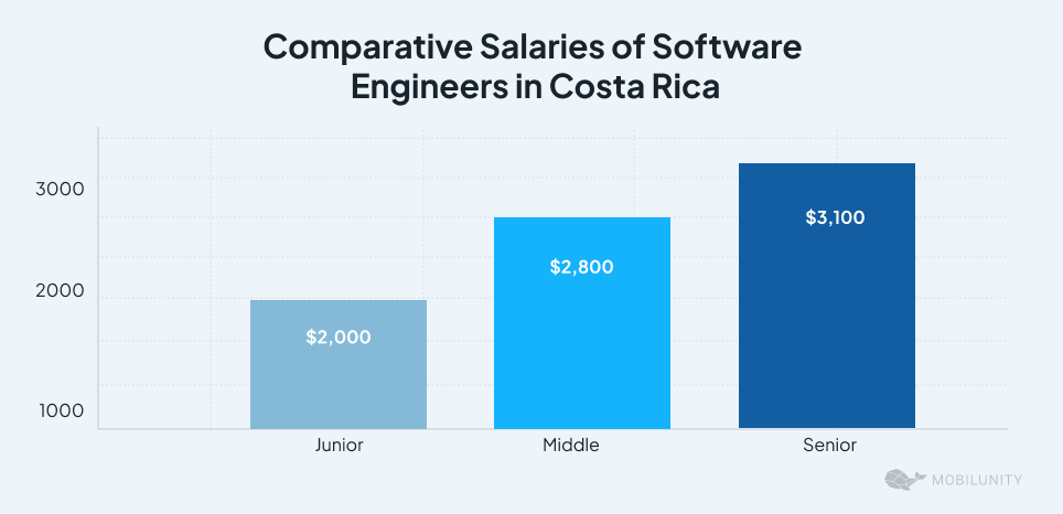Let’s take a look at the costs of hiring Costa Rican software developers and Ukrainian ones. The comparison table below is created based on Worldsalaries.com, Levels.fyi data and Mobilunity’s Recruiting Team research over several local job portals.