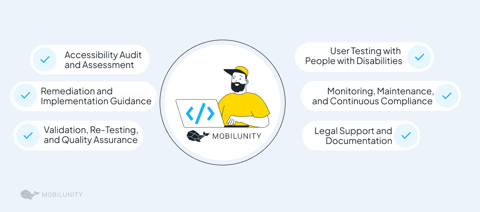 Working with Mobilunity gives you access to vetted ADA experts and ongoing support. All of this is aimed at making your website accessible and compliant.
