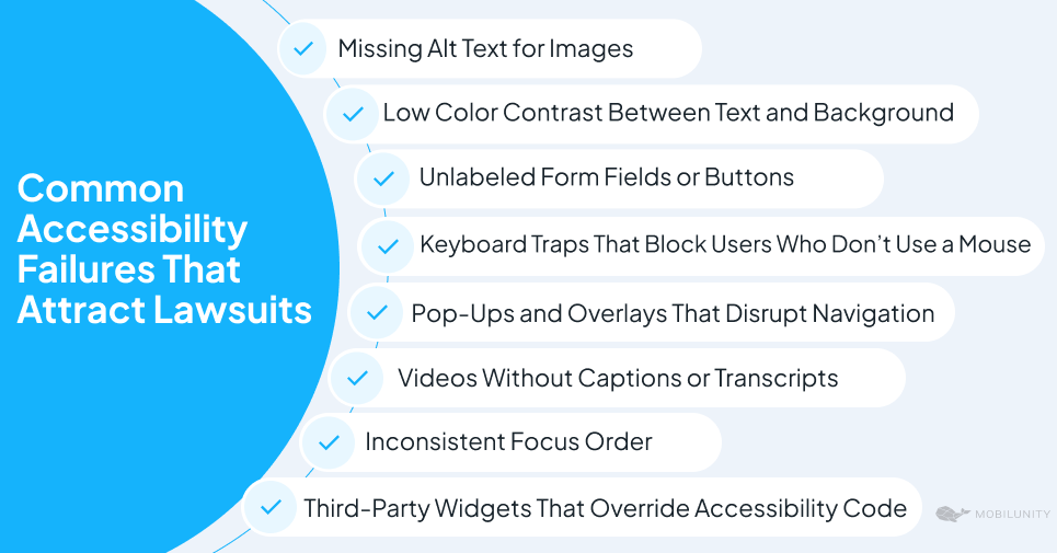 Following these guidelines should be enough to stay compliant. However, it is not that simple. Often, without the help of an ADA web compliance expert or a team, you may make some common mistakes. Consultants frequently see the same technical issues and plaintiffs usually sue over them: