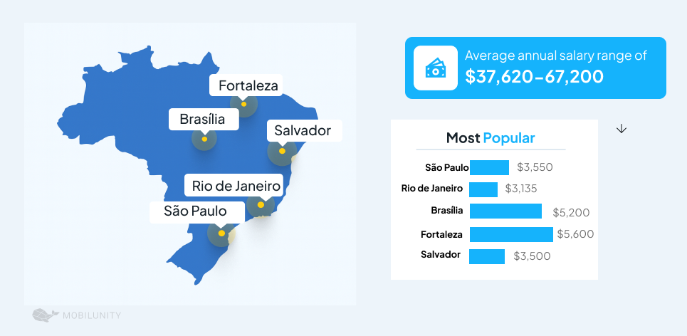 Software engineers are drawn to Sao Paulo, Brazil’s thriving commercial and technological center. So Paulo’s average monthly wage is $3,550, and the city is home to around 30,000 developers who are changing the city’s digital scene. The city’s growing IT environment, reflected in the city’s competitive wage, attracts people from all over the world.