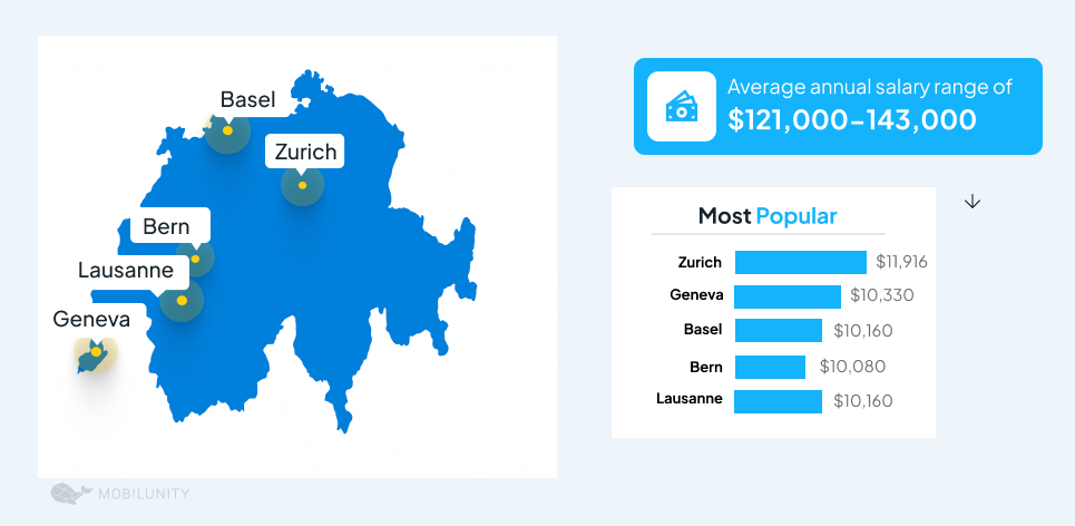 Software development services in Switzerland are available in many cities. So you can find your ideal specialist quite easily. But there are several main cities where the country’s best personnel gather. Let’s compare the average salary of a software developer in Switzerland.