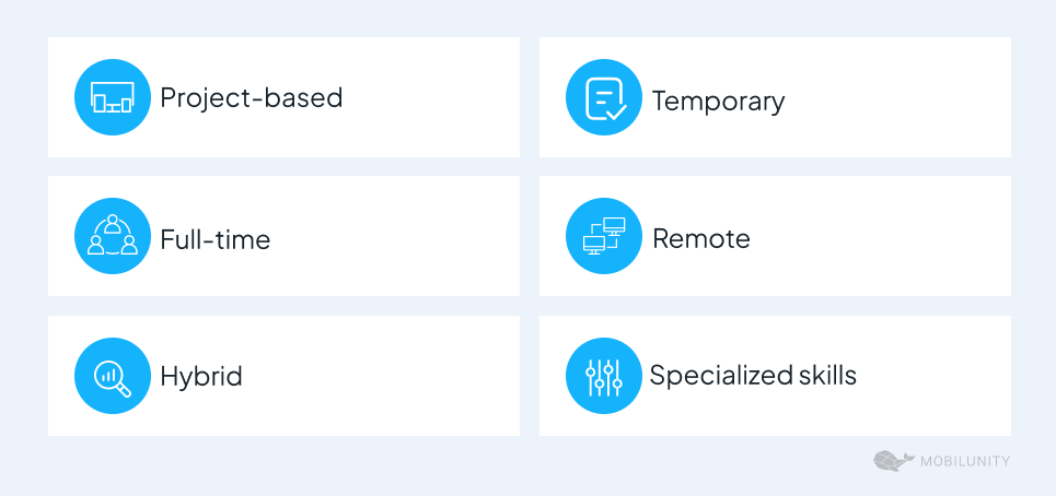 - Specialized skills. This one is a popular type due to the shortage of specialists on the market. It can be temporary or long-term, helping bring rare skills that aren’t available within the team, handle specific tasks requiring a narrow expertise, or check whether this role will benefit your company.