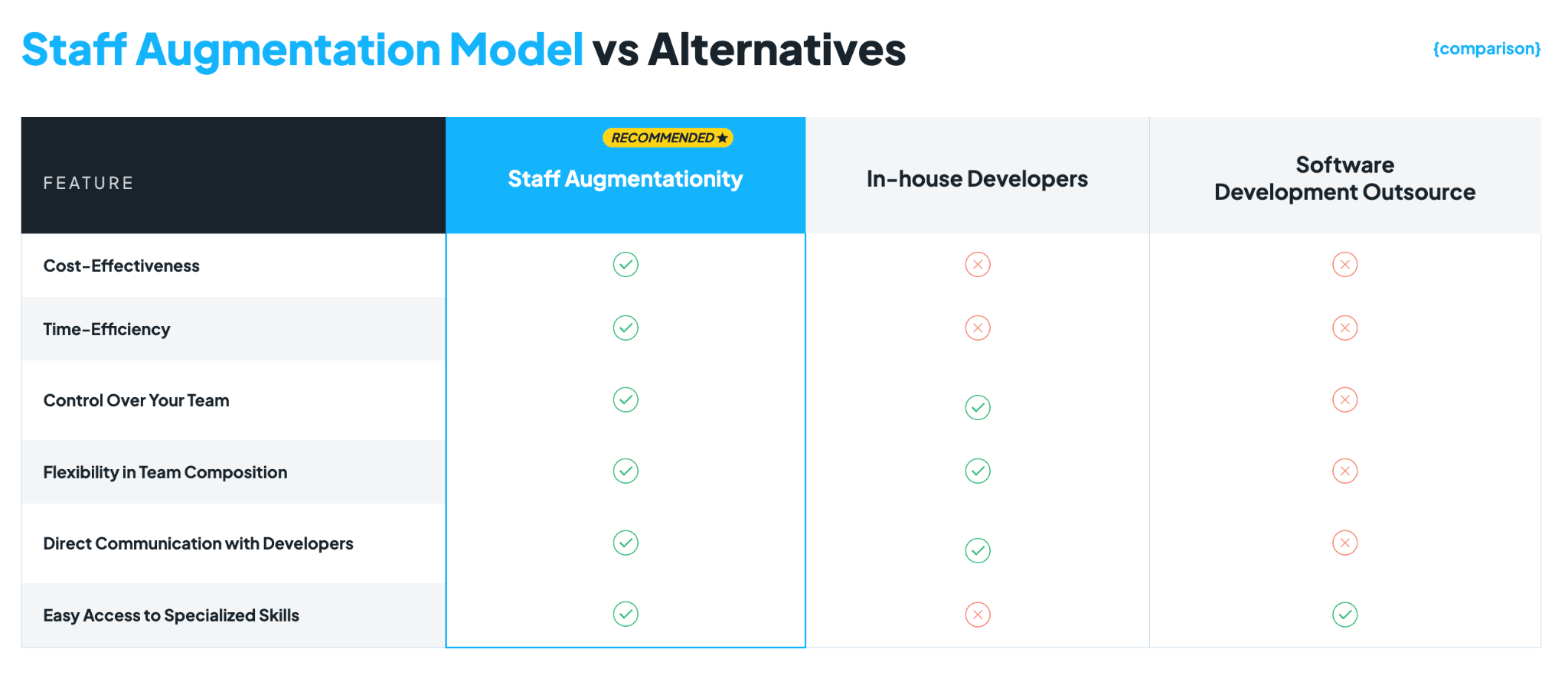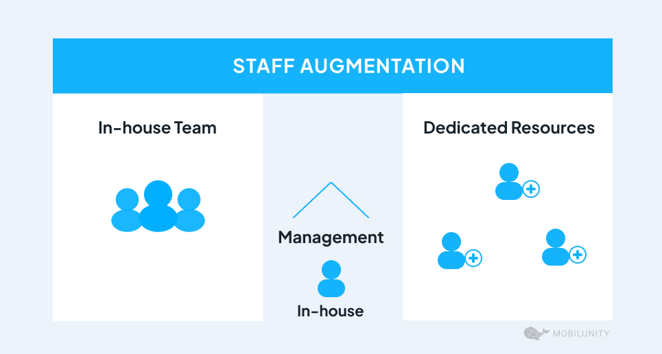 | – Cost optimization. It helps lower costs since you don’t need to go through lengthy hiring cycles, pay taxes and benefits for the new workers. – Time to market. Filling the gaps in your team with missing resources helps launch and scale projects faster. – Global talent market. You can augment your team with staff from abroad, choosing countries with expertise that the local one lacks. – Flexibility and scalability. Organizations can scale their teams up and down based on project demands, without the burden of long-term commitments. – Control and collaboration. It allows companies to oversee project execution and quality fully without relying onthird parties for the outcomes. | – Management overhead. Staff augmentation requires a strong internal management capacity, and could lead to a management style that doesn’t plan for resource consumption. – Project duration. It’s more suited for short-term projects, since the benefit derived from avoiding hiring costs may be lost over time. – Accountability. The client assumes full responsibility for the deliverables, project success, workflows, and deadlines. – Knowledge control. Contractors accumulate information that the company may depend on, requiring a solid knowledge sharing strategy, so it’s not lost when the employee leaves. |