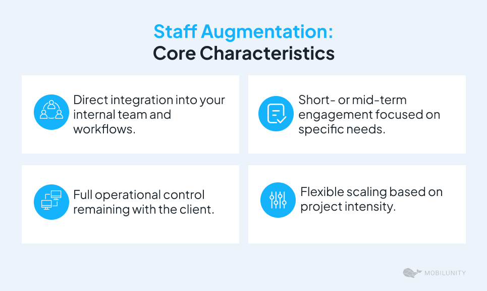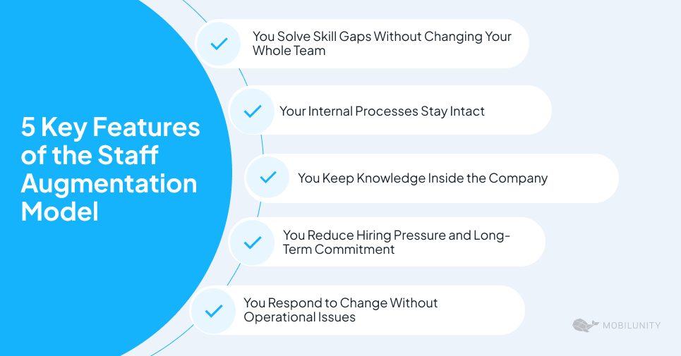 With staff augmentation, you don’t need to adjust to someone else’s workflows or project management style. The specialists fit with your tools, communication standards, and decision-making process. This keeps execution consistent and avoids the tension that often comes with outside delivery methods.