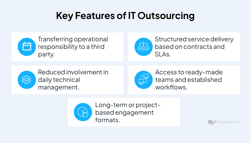 IT outsourcing is a way for a company to hand over certain IT tasks, services, or entire projects to an external provider. This provider takes charge of planning, executing, and delivering results. Rather than expanding their internal team, the business relies on the vendor’s infrastructure, processes, and abilities, treating them as a separate extension of the company.